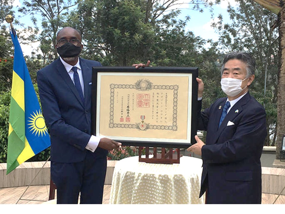 Japanese envoy to Rwanda, Masahiro Imai hands over the decoration of the ‘The Order of the Rising Sun, Gold and Silver ray’ award to veteran Karateka…