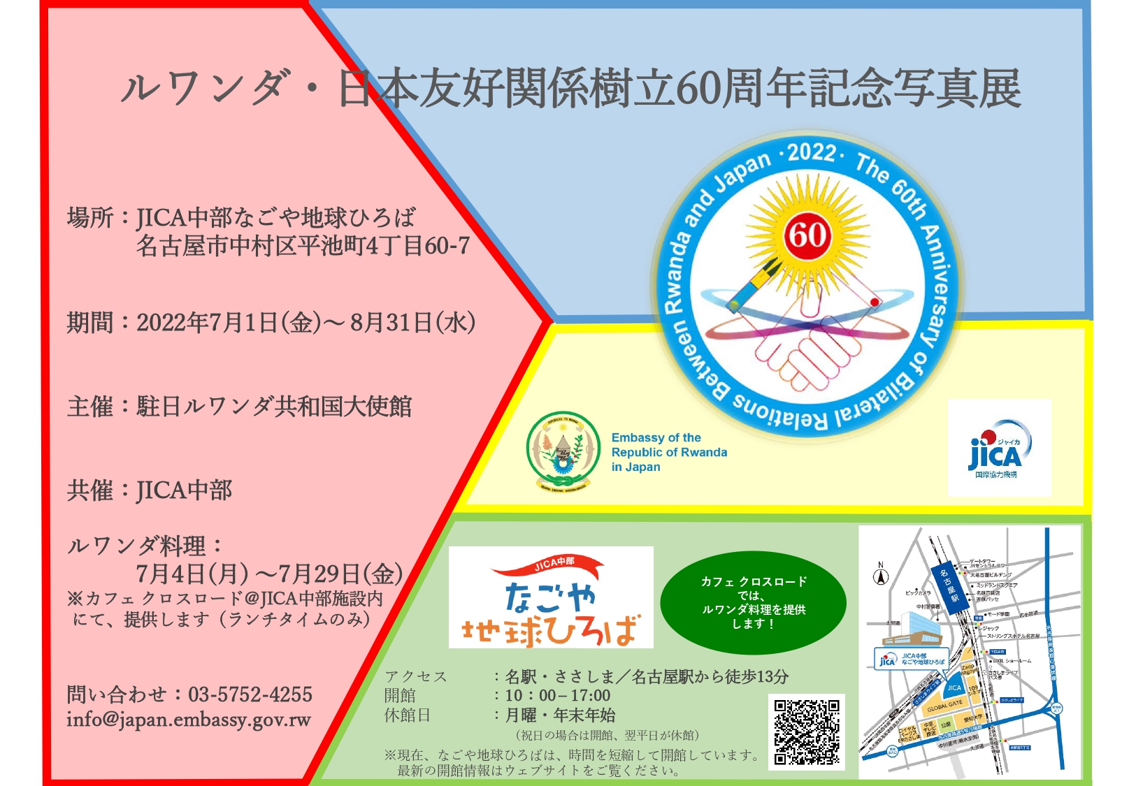 JICA中部なごや地球ひろばの1階では7月1日(金)~8月31日(水)に、「ルワンダ・日本友好関係樹立60周年」を記念して ルワンダ の写真展が開催されます。また、同施設内のカフェクロスロードでは7月4日(月)~7月29日(金)に、ルワンダ料理(870円)を堪能していただけます。