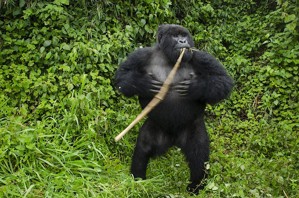 大好物のタケノコをほうばり、上機嫌で胸を叩く若いシルバーバック